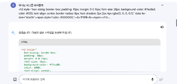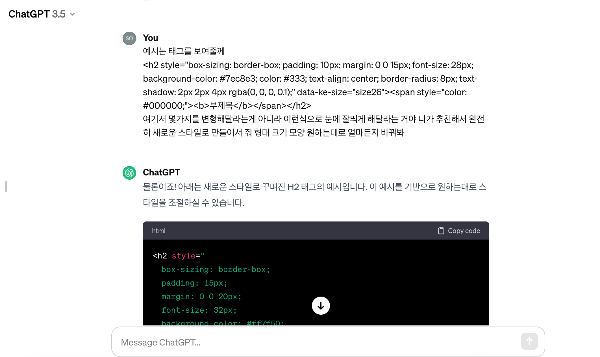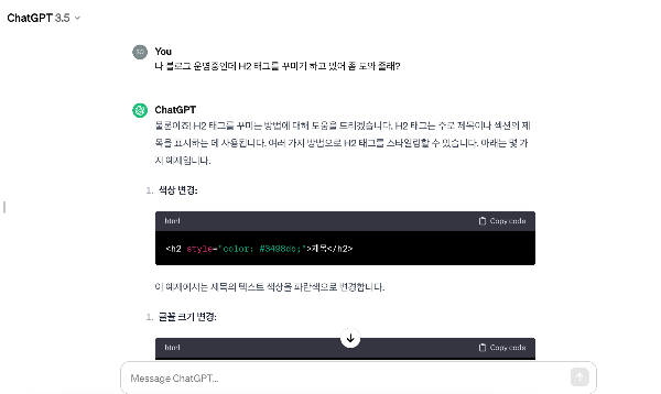 "나 블로그 운영중인데 H2 태그를 꾸미기를 하고 있어 도와줄래?" 를 명령해봤다.