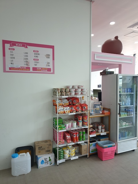 음료, 과자, 라면, 햇반, 쌈장 등 구비되어 있어 구매하실 수 있어요.