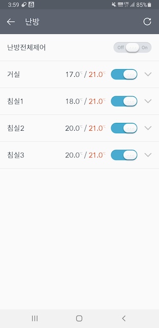 실제 설정온도까지 방마다 도달시간은 달랐습니다. 어느 방은 빨리 도달했고 특히 거실은 늦게 도달했습니다.